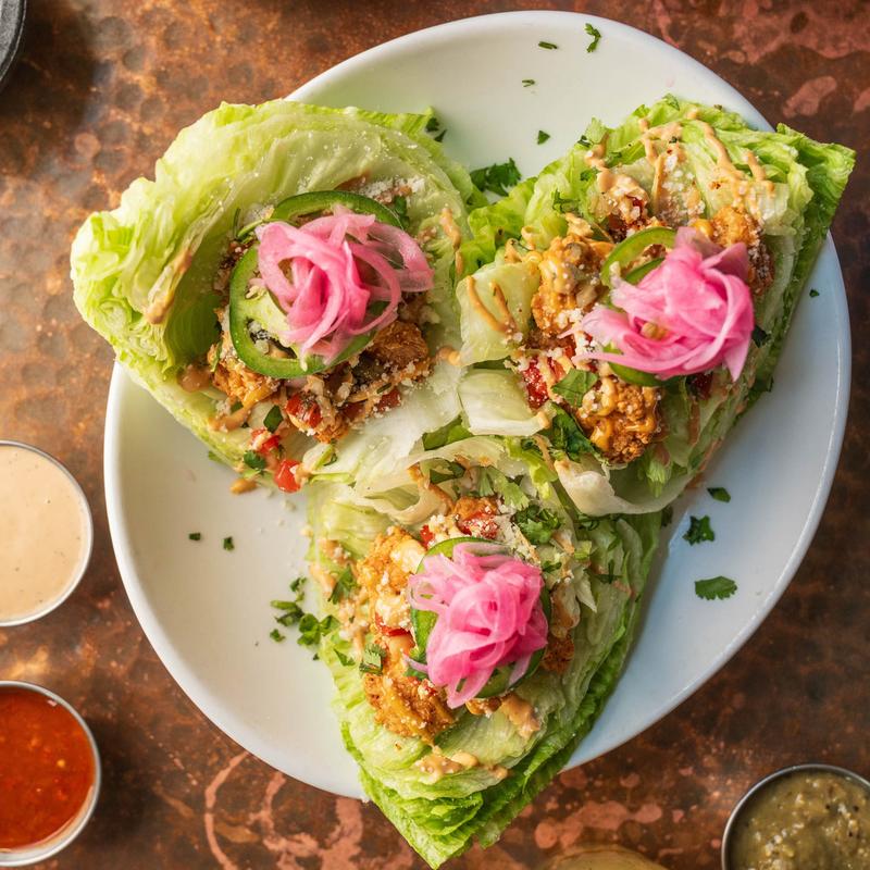 Asian steak tacos, seasonal pickled vegetables, kimchi pico de gallo, iceberg lettuce leaves, steamed white rice, and gochujang aioli.