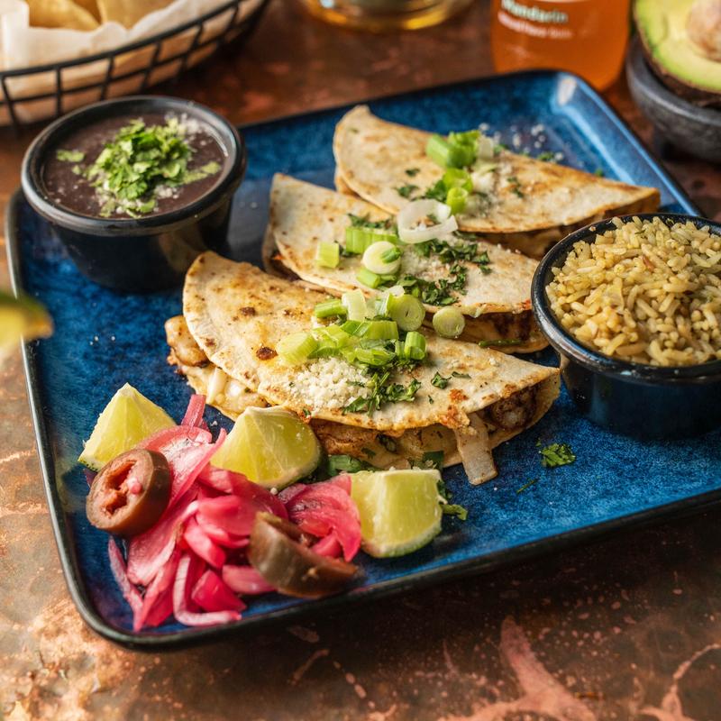 Blackened shrimp, Monterey Jack, green onions, cotija cheese, pickled onion, and cilantro on flour tortillas served with a choice of fusion-enhancing sauce.