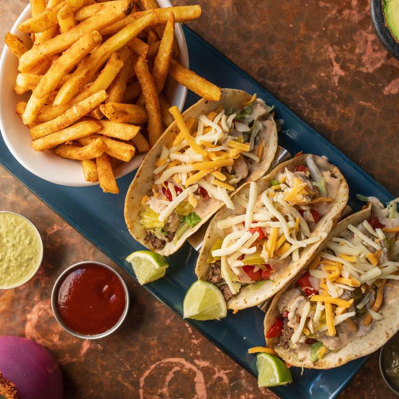 Crispy cheese flour tortilla, ground beef, lettuce, tomatoes, pickles, cheddar cheese, onions, and sunrise sauce served with fries.