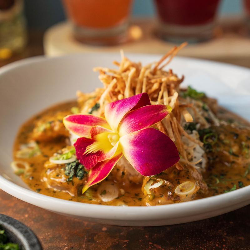 Crispy fried chicken, pimento cheese, black vinegar coleslaw, gochujang aioli, and cilantro.
