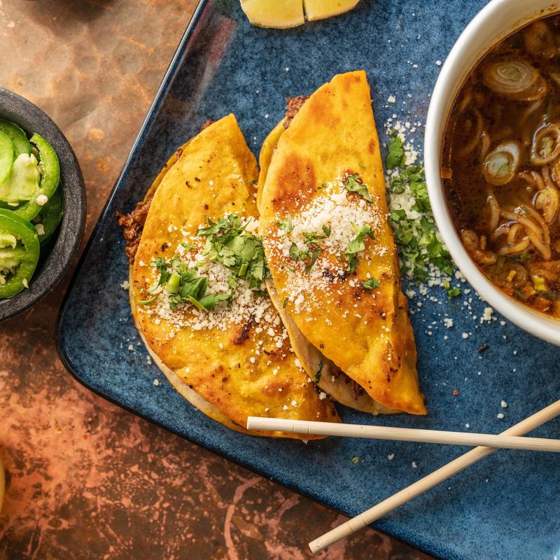 2 braised beef birria, Monterey Jack cheese, onions, cilantro with birria jus, and an infused bowl of sanukiya ramen noodles topped with green onions.