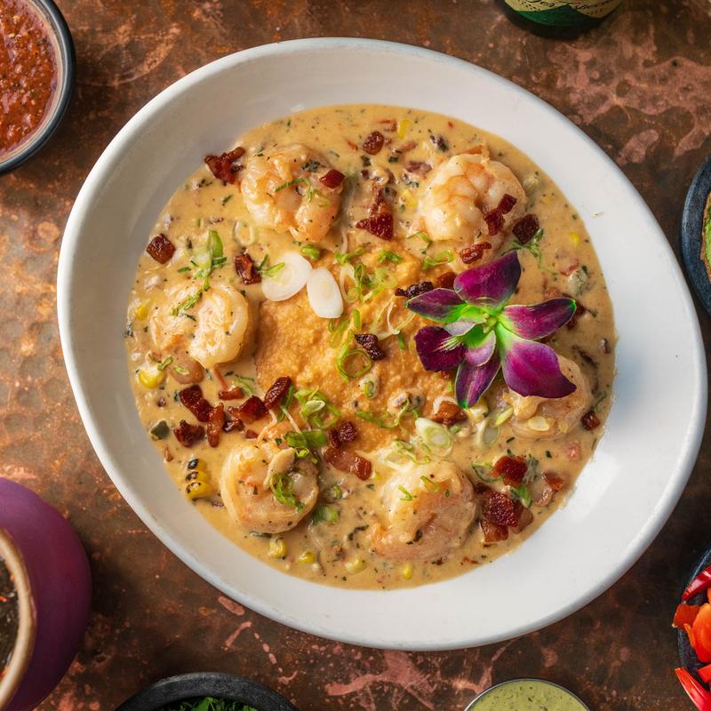 Shrimp, chipotle cotija butter, pico de gallo, green onions, tequila, corn, bacon served over guajillo grits.