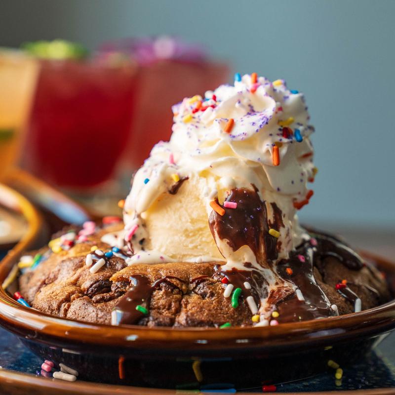 Served with whipped cream, sprinkles, and chocolate sauce on the side.